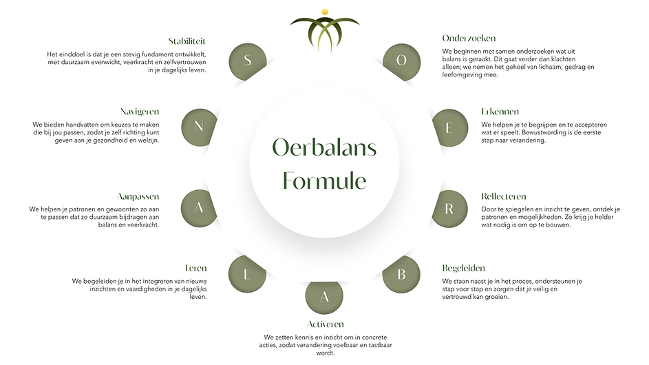 De Oerbalans Formule is de leidraad van onze begeleiding. Het is een zorgvuldig opgebouwd proces waarin inzicht, samenwerking en opbouw centraal staan. We werken niet met vaste protocollen, maar met een aanpak die meebeweegt met jouw hulpvraag en jouw ontwikkeling.
